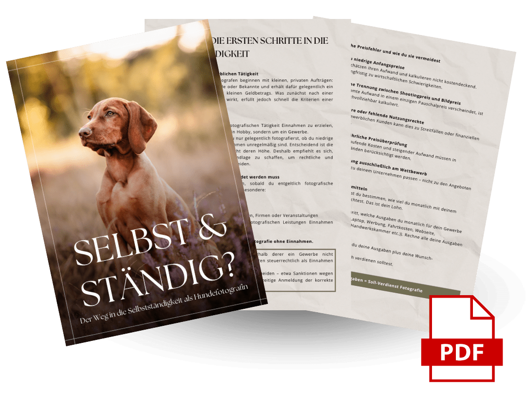 Mit diesem E-Book bekommst du einen kompakten, praxisnahen Leitfaden an die Hand, der dir Schritt für Schritt zeigt, wie du aus deiner Leidenschaft für Hundefotografie ein solides, nachhaltiges Business machst. Von der Gewerbeanmeldung bis zur Preisgestaltung, von Buchführung bis Vertragswesen — alle wichtigen Themen sind verständlich erklärt und auf den Punkt gebracht.