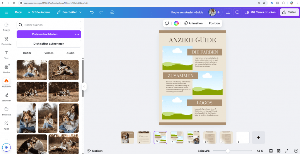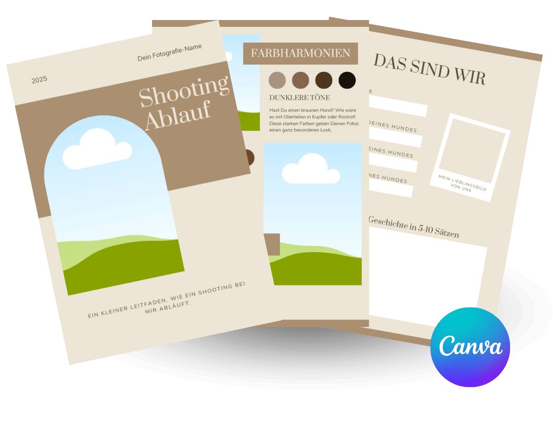 Ich habe diese Canva-Vorlagen für Steckbrief, Shooting-Ablauf und Klamotten-Guide erstellt, um dir die Kundenkommunikation zu erleichtern.