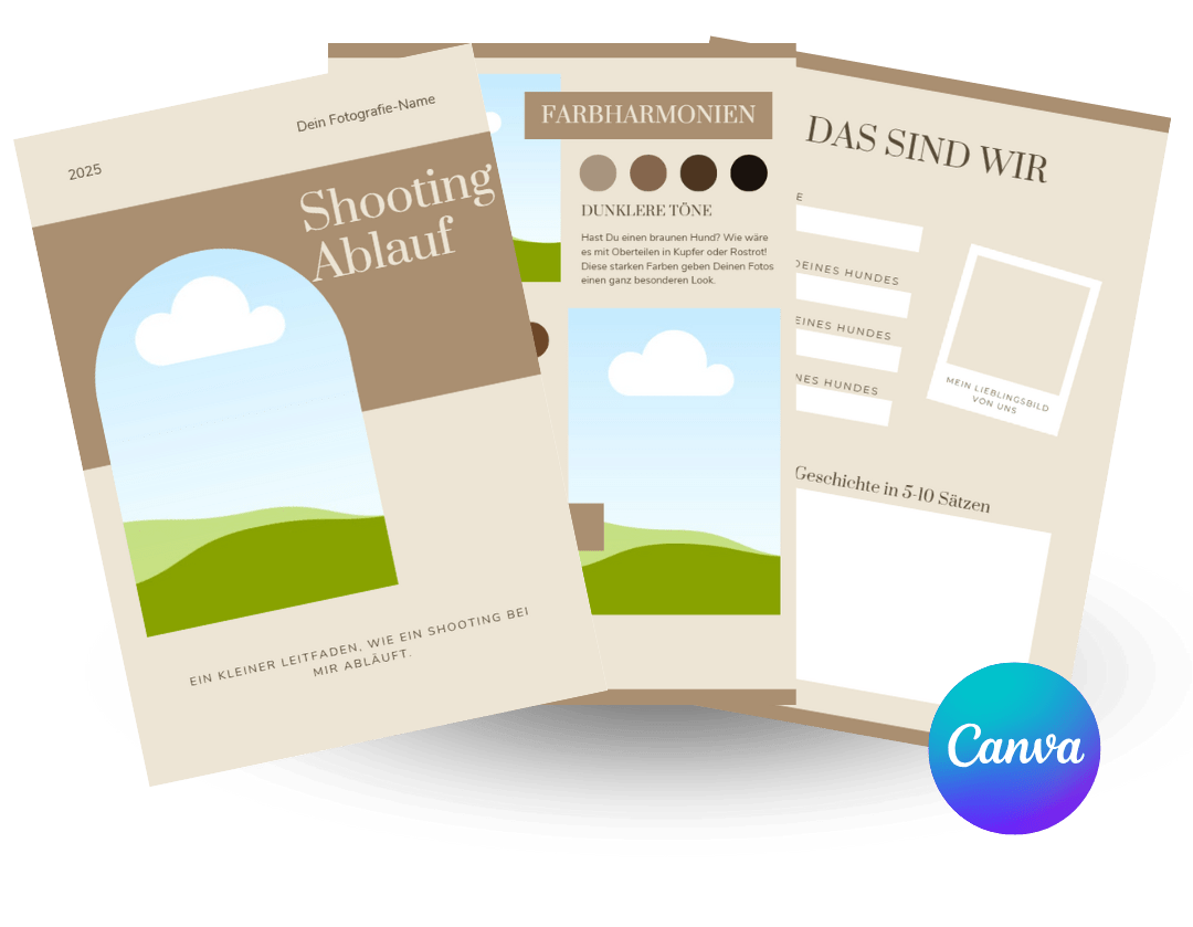 Das Kunden-Bundle besteht aus drei verschiedenen Canva-Vorlagen, die Du ganz nach Deinen Wünschen personalisieren und anpassen kannst. So wird Deine Kundenkommunikation professioneller und Du sorgst für ein tolles Shooting-Erlebnis.