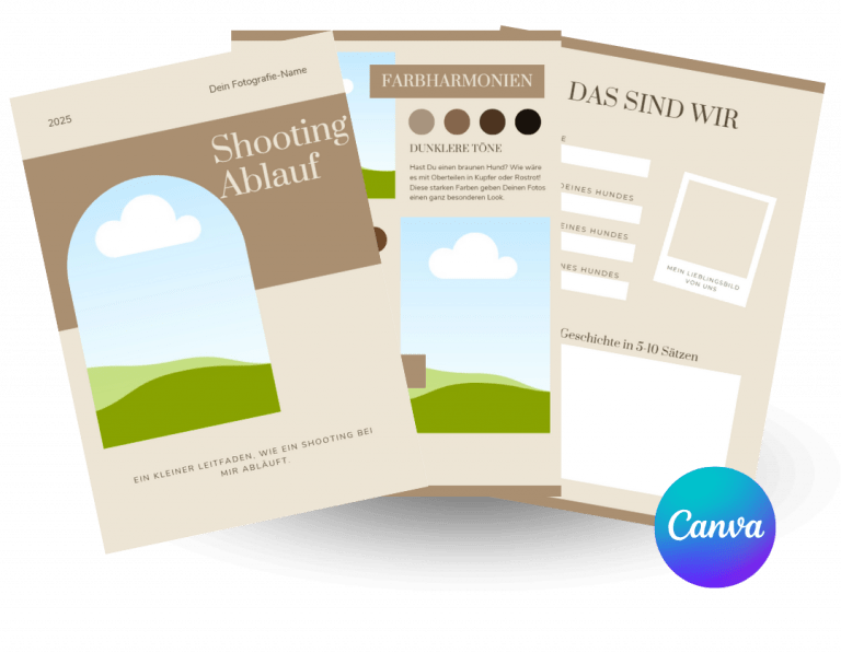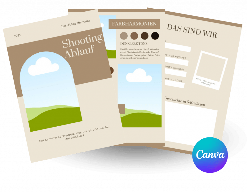 Ich habe diese Canva-Vorlagen für Steckbrief, Shooting-Ablauf und Klamotten-Guide erstellt, um dir die Kundenkommunikation zu erleichtern. Du kannst sie ganz einfach in Canva nach deinen Wünschen anpassen und personalisieren.